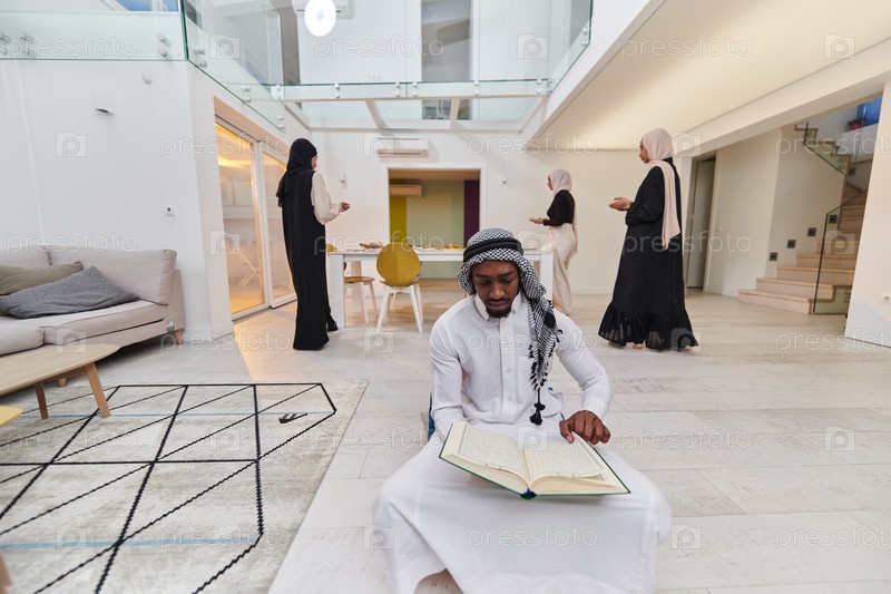 В священный месяц Рамадан афроамериканец-мусульманин, поглощенный чтением Священного Корана, окружен фоном, на котором три женщины в хиджабе готовят и подают еду для ифтара, изображая сцену духовной преданности, культурного единства и общественного праздн