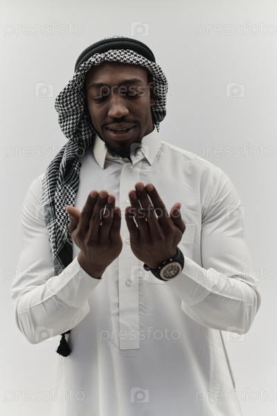 Афроамериканский мусульманин поднимает руки в молитве, ища утешения и преданности Богу, стоя изолированно на безмятежном белом фоне, символизируя глубокое выражение веры и созерцания