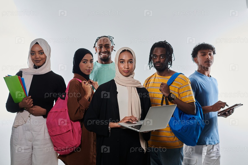 Группа разнообразных студентов занимается современными образовательными практиками, используя различные технологические инструменты, такие как ноутбуки, планшеты и смартфоны, на чистом белом фоне, иллюстрируя современный подход к совместному обучению и до