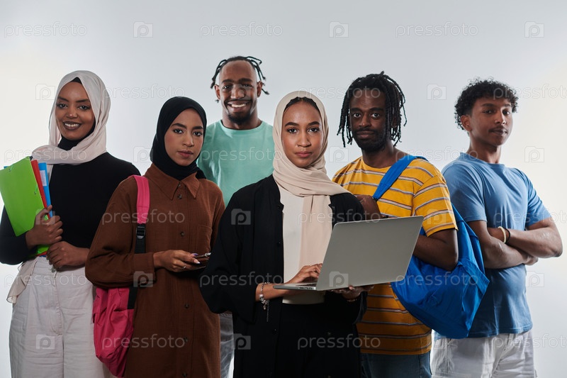 Группа разнообразных студентов занимается современными образовательными практиками, используя различные технологические инструменты, такие как ноутбуки, планшеты и смартфоны, на чистом белом фоне, иллюстрируя современный подход к совместному обучению и до