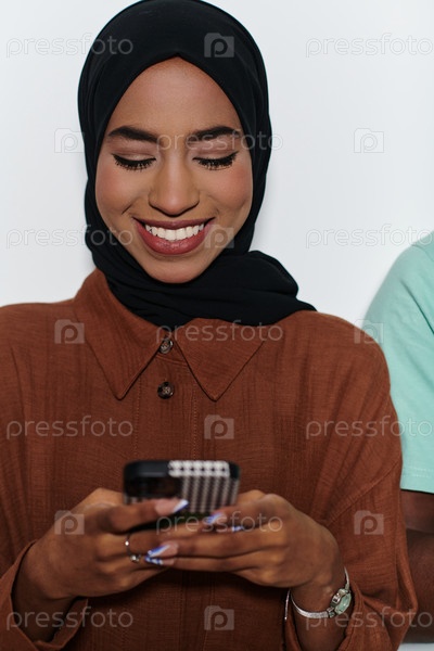 Элегантная арабская женщина, одетая в хиджаб, взаимодействует с современностью, используя смартфон: сопоставление традиционной одежды с современными технологиями, запечатленное в изолированной обстановке на первозданном белом фоне