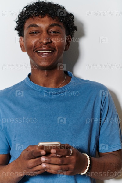 Афроамериканский подросток пользуется своим смартфоном на первозданном белом фоне, воплощая суть современных цифровых технологий и молодежной культуры