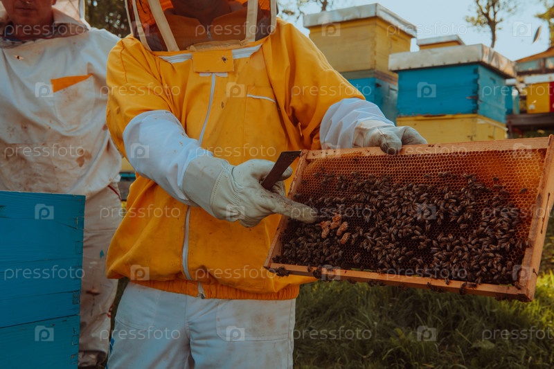 Пчеловоды проверяют мед на рамке улья в поле. Владельцы малого бизнеса на пасеке. Производитель натуральных здоровых продуктов питания работает с пчелами и ульями на пасеке