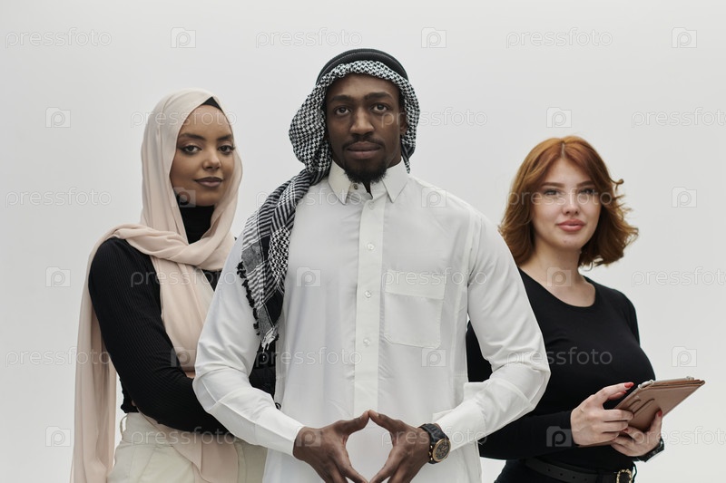 Арабский бизнесмен уверенно стоит рядом с двумя деловыми женщинами, изображая уравновешенную и разнообразную команду, олицетворяющую амбиции, инновации и дальновидное лидерство на первозданном белом фоне
