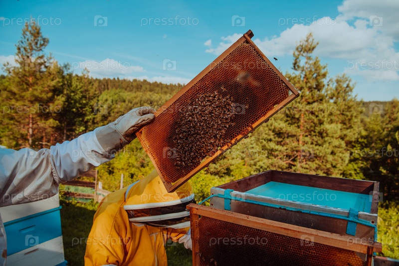 Пчеловоды проверяют мед на рамке улья в поле. Владельцы малого бизнеса на пасеке. Производитель натуральных здоровых продуктов питания работает с пчелами и ульями на пасеке
