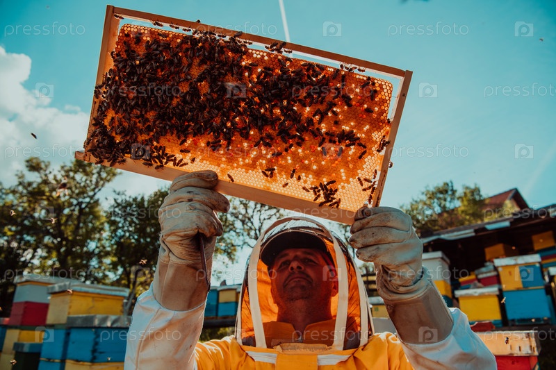 Широкий снимок пчеловода, держащего рамку улья, наполненную медом, на фоне солнечного света в поле, полном цветов