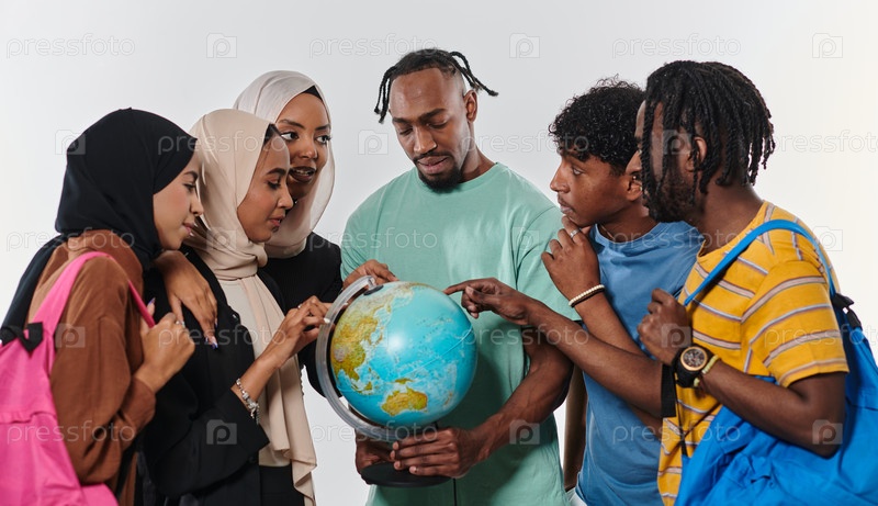 Разнообразная группа студентов собралась по всему миру, поглощенная исследованиями и учебой, их яркая энергия запечатлена на первозданном белом фоне, символизируя единство и любопытство в их образовательном путешествии