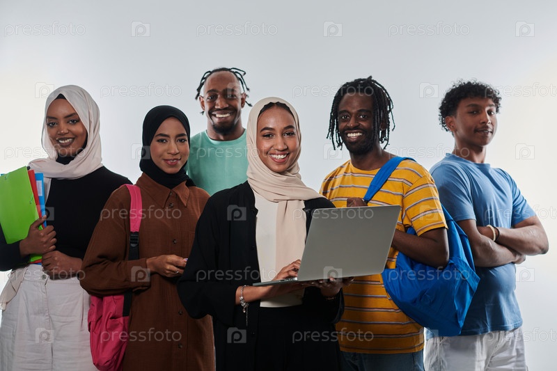 Группа разнообразных студентов занимается современными образовательными практиками, используя различные технологические инструменты, такие как ноутбуки, планшеты и смартфоны, на чистом белом фоне, иллюстрируя современный подход к совместному обучению и до