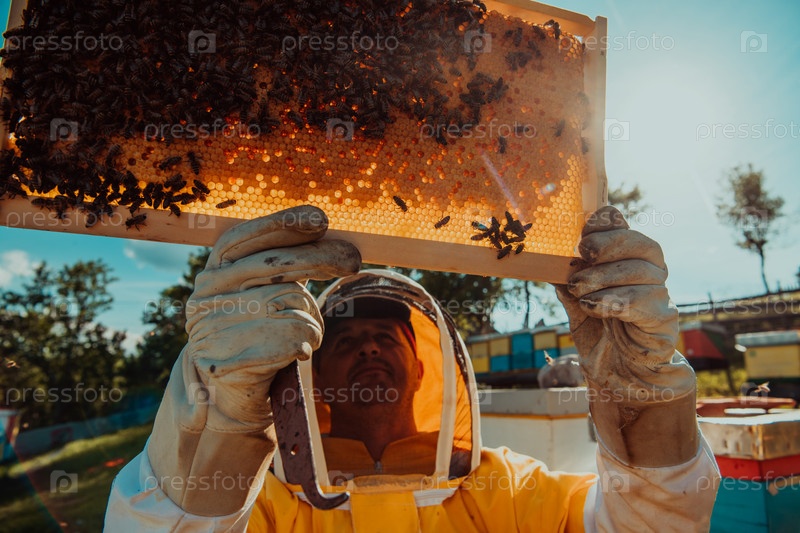 Широкий снимок пчеловода, держащего рамку улья, наполненную медом, на фоне солнечного света в поле, полном цветов