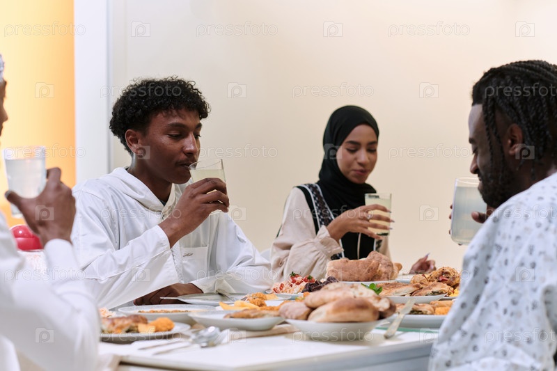 Традиционная и разнообразная мусульманская семья собирается вместе, чтобы разделить вкусную трапезу ифтар во время священного месяца Рамадан, воплощая суть семейной радости, культурного богатства и духовного единства в их общем праздновании