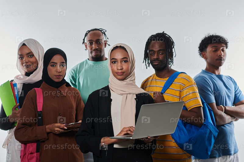 Группа разнообразных студентов занимается современными образовательными практиками, используя различные технологические инструменты, такие как ноутбуки, планшеты и смартфоны, на чистом белом фоне, иллюстрируя современный подход к совместному обучению и до
