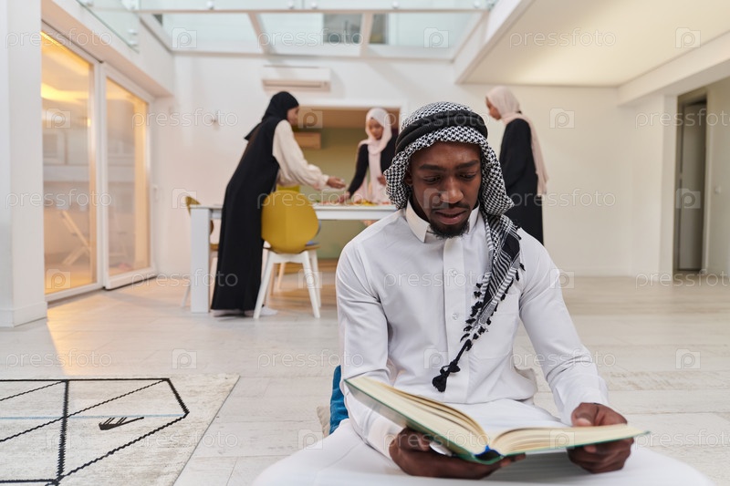 В священный месяц Рамадан афроамериканец-мусульманин, поглощенный чтением Священного Корана, окружен фоном, на котором три женщины в хиджабе готовят и подают еду для ифтара, изображая сцену духовной преданности, культурного единства и общественного праздн