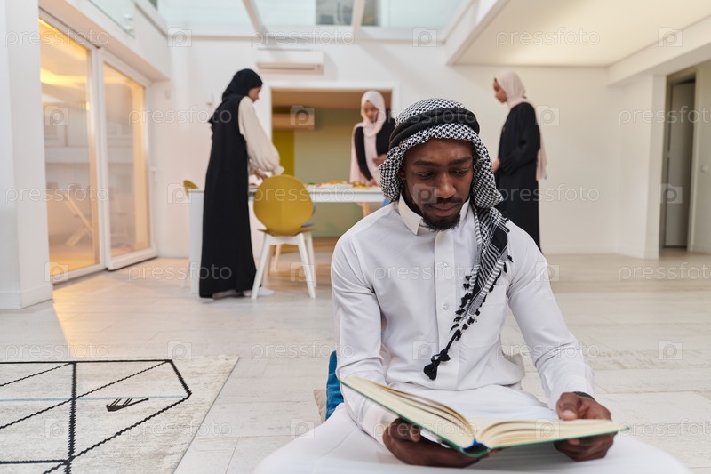 В священный месяц Рамадан афроамериканец-мусульманин, поглощенный чтением Священного Корана, окружен фоном, на котором три женщины в хиджабе готовят и подают еду для ифтара, изображая сцену духовной преданности, культурного единства и общественного праздн