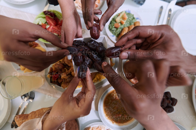 На пронзительном крупном плане разные руки мусульманской семьи деликатно сжимают свежие финики, символизируя прекращение поста во время священного месяца Рамадан, запечатлевая момент культурного единства, общих традиций и радостного ожидания общего ифтара