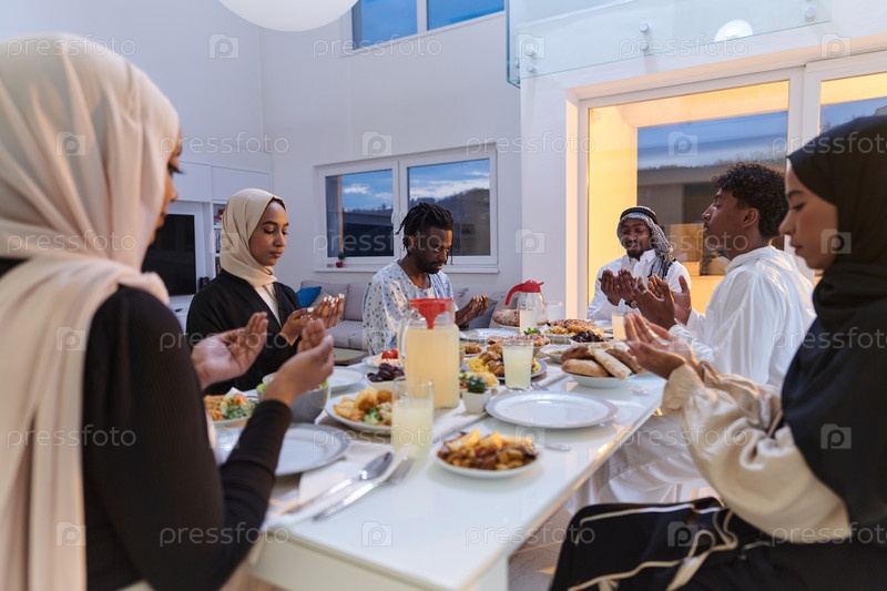 В священный месяц Рамадан разнообразная мусульманская семья объединяется в духовном единстве, горячо молясь Богу перед разговением, фиксируя момент коллективной преданности, культурного разнообразия и семейной радости посреди священного праздника