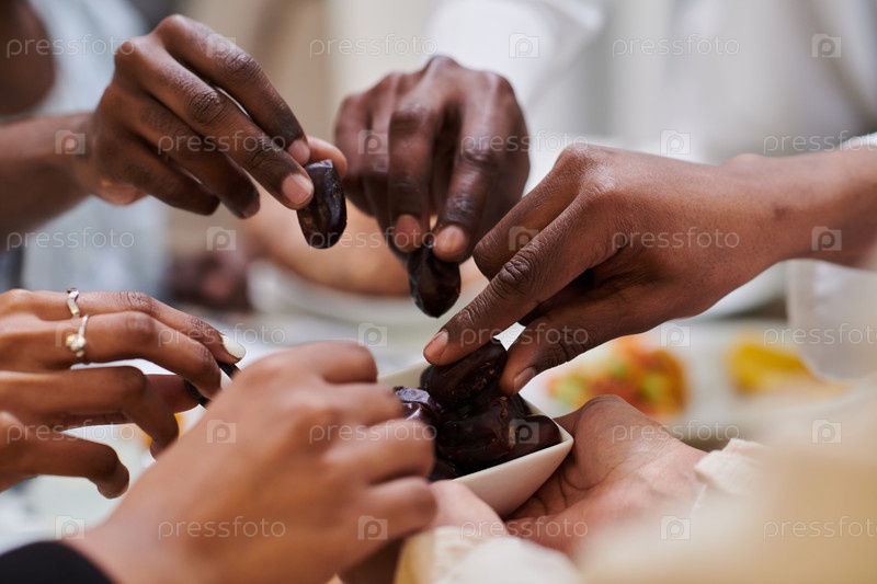 На пронзительном крупном плане разные руки мусульманской семьи деликатно сжимают свежие финики, символизируя прекращение поста во время священного месяца Рамадан, запечатлевая момент культурного единства, общих традиций и радостного ожидания общего ифтара