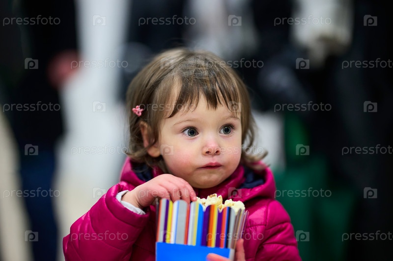Маленькая девочка охотно покупает попкорн в кинотеатре перед началом фильма, ее глаза сверкают от волнения