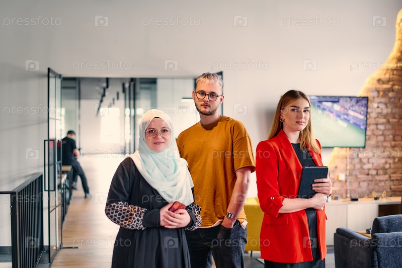 Группа молодых коллег по бизнесу, в том числе женщина в хиджабе, стоит вместе в современном коридоре просторного коворкинг-центра для стартапов, олицетворяя разнообразие и дух сотрудничества