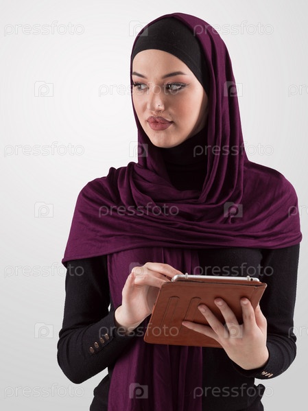 Красивая и современная молодая арабская бизнесвумен в хиджабе, использующая планшетный компьютер, позирующая на светлом фоне и улыбающаяся в камеру. Концепция разнообразия бизнеса, мусульманка