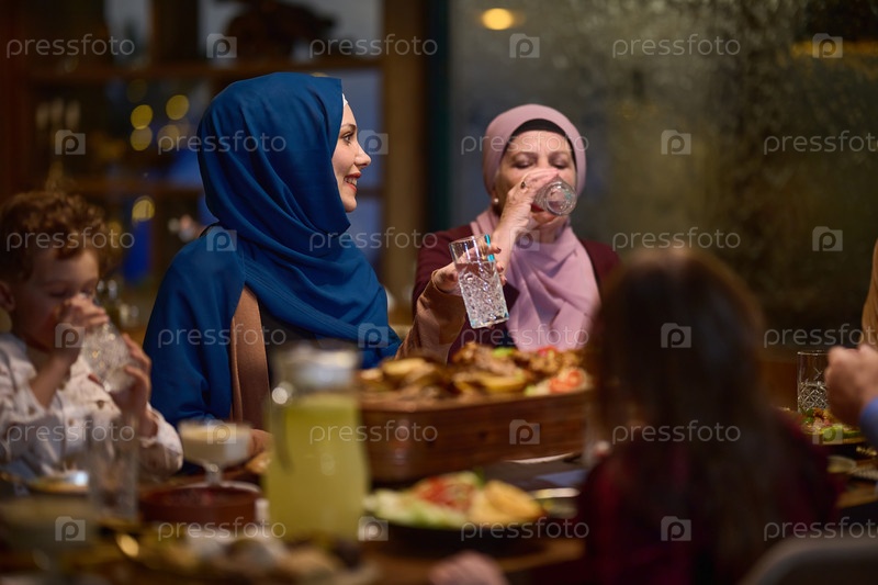 Современная и традиционная европейская исламская семья собирается вместе на ифтар в современном ресторане во время поста Рамадан, олицетворяя культурную гармонию и семейное единство среди кулинарного праздника разнообразия