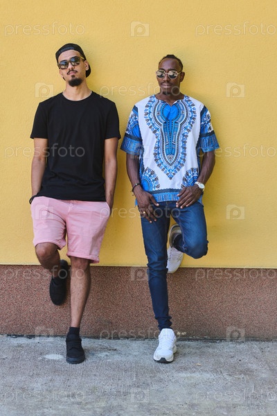 Два друга-мужчины: афроамериканский подросток в суданской традиционной одежде, прислоненный к желтой стене
