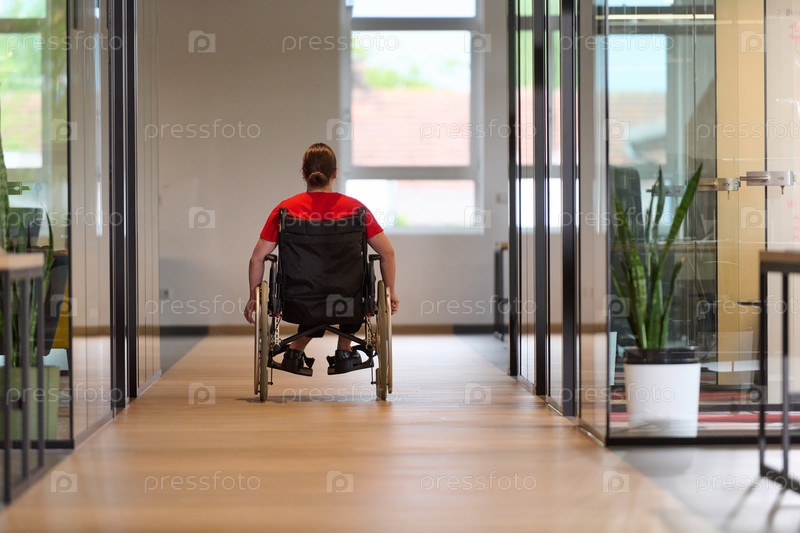 Современная молодая деловая женщина в инвалидной коляске окружена инклюзивным рабочим пространством со стеклянными стенами офисов, олицетворяющим решимость и новаторство в деловом мире