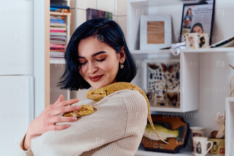 Красивая женщина позирует со своими двумя очаровательными бородатыми драконами