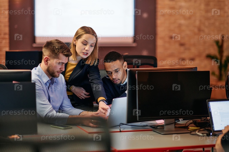 Стратегическая деловая встреча: группа профессионалов, сотрудничающих в офисе с помощью компьютеров
