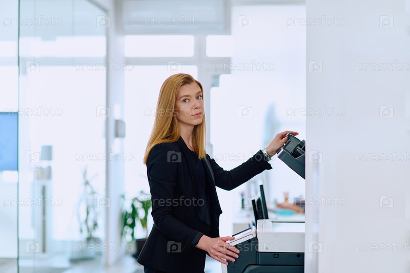 Блондинка-бизнесмен, использующая принтер в офисе