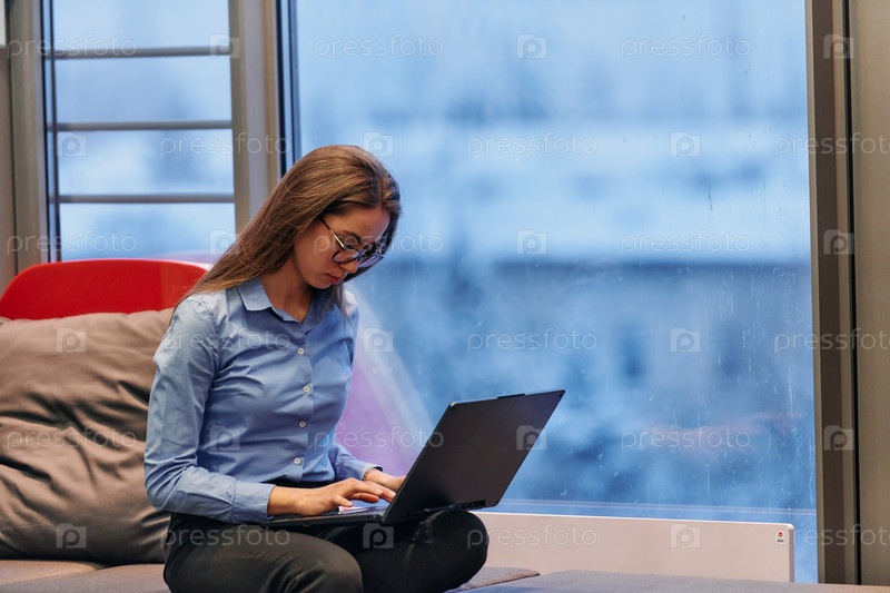 Деловая женщина использует свой ноутбук, сидя у окна большого корпоративного здания, на фоне которого открывается живописный вид на городской пейзаж
