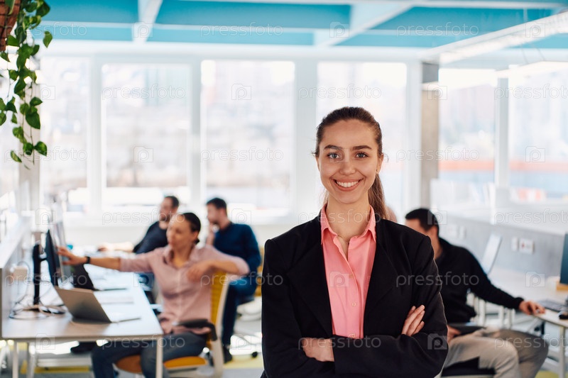 Портрет молодой улыбающейся деловой женщины в творческом коворкинг-стартапе на открытом пространстве. Успешная деловая женщина, стоящая в офисе с копировальным пространством. Коллеги работают в фоновом режиме