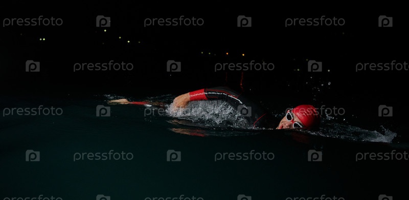 Решительный профессиональный триатлонист проходит тщательную ночную тренировку в холодной воде, демонстрируя преданность делу и стойкость в подготовке к предстоящим соревнованиям по триатлону по плаванию