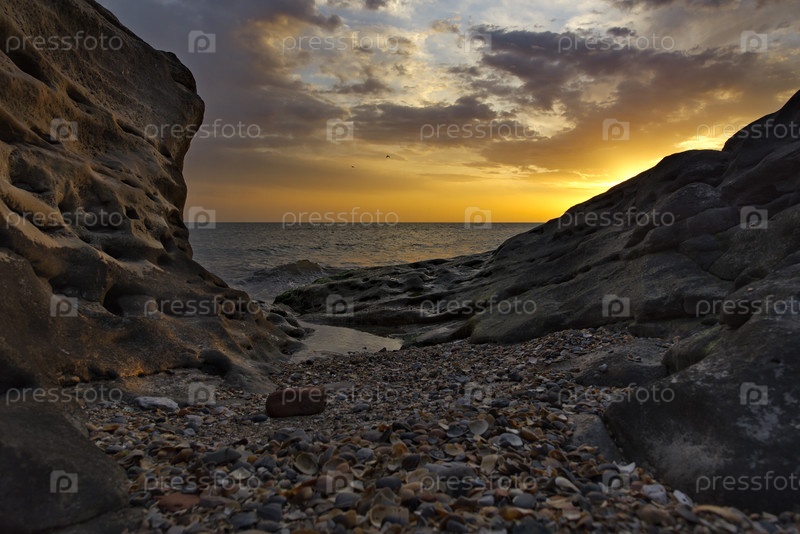 Россия. Дагестан. Рассвет на усыпанном ракушками скалистом берегу Каспийского моря недалеко от городской набережной Махачкалы