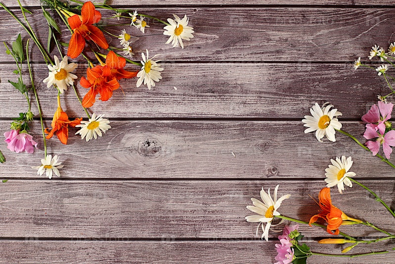 Цветы лилий, ромашек и мальв на старом деревянном фоне, летний и осенний баннер для рекламы продукции, абстрактная цветочная композиция, деревенский стиль, праздничная открытка,
