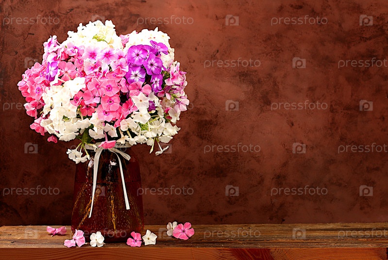 Красивый натюрморт с букетом флоксов на старом деревянном столе, осенний баннер, абстрактная цветочная композиция, деревенский стиль, праздничная открытка и шаблон экрана с местом для текста,