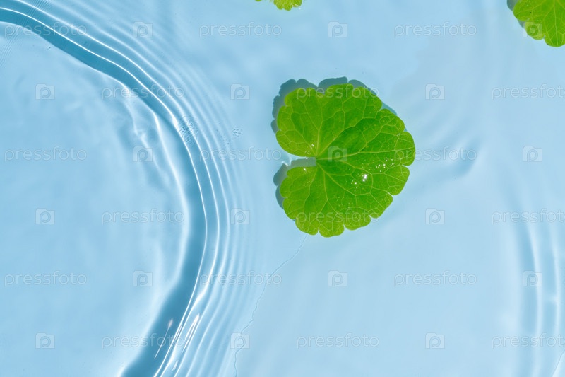 Текстура голубой воды, голубая мятная поверхность воды с волнами и рябью. Фон концепции спа. Плоская планировка, пространство для копирования. Зеленый лист плавает