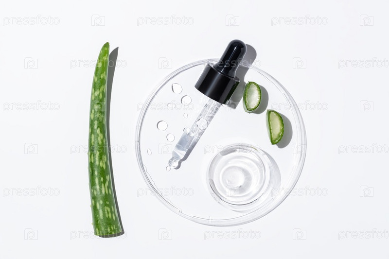 Чашка Петри с гелем алоэ и каплями экстракта. Пипетка-капельница рядом с кусочками растения алоэ вера. Лабораторные исследования косметики, органической