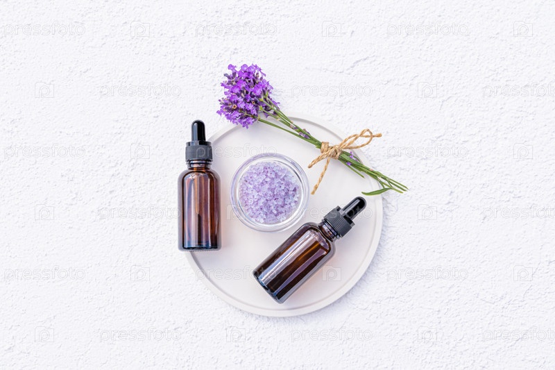 Косметическое лавандовое масло, сыворотка для ухода за телом, соль для ванн на белом круглом подносе. вид сверху. белый фон. букет свежей лаванды