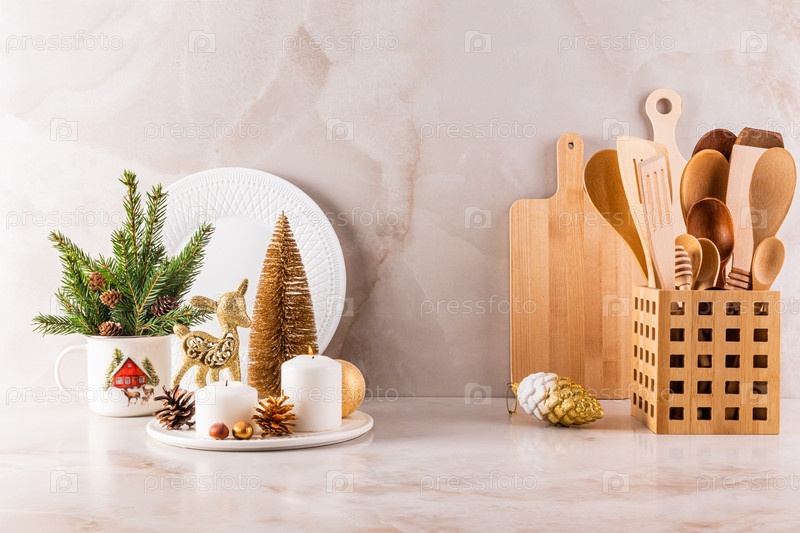 Экологичная кухонная столешница, оформленная к новогодним и рождественским праздникам в стильных светло-золотистых тонах. эко кухонная утварь. Передний план