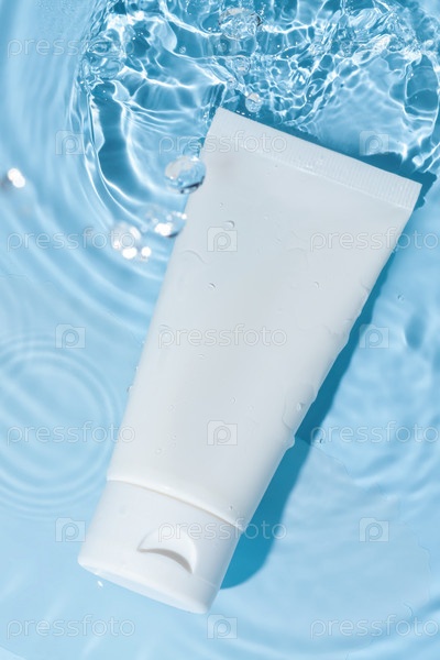 Макет белого пластикового кремового тюбика с косметическим продуктом для увлажнения в воде на синем фоне. Шаблон для дизайна. Тюбик солнцезащитного крема на поверхности голубой воды. Косметическая концепция летнего отдыха