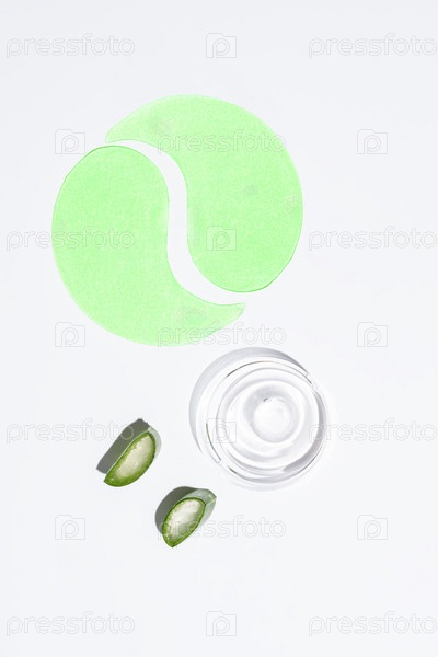 Гидрогелевые патчи от темных кругов под глазами с алоэ вера на белом фоне с текстовыми трубками и листьями алоэ. Лабораторные исследования