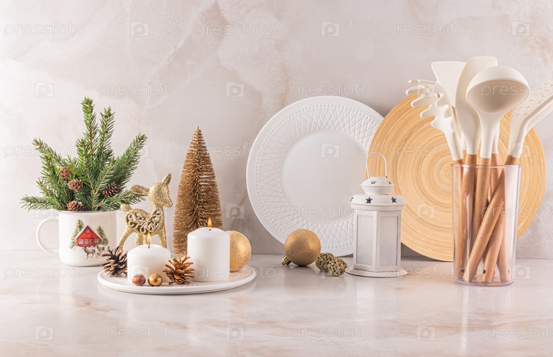 Красивая мраморная светлая кухонная столешница, оформленная в золотисто-белом цвете к Новому году. стильные украшения, посуда, набор кухонных принадлежностей