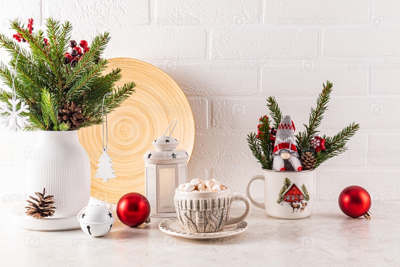Чашка ароматного какао с зефиром на праздничной новогодней столешнице, украшенной к Новому году и Рождеству. Передний план. Стена из белого кирпича