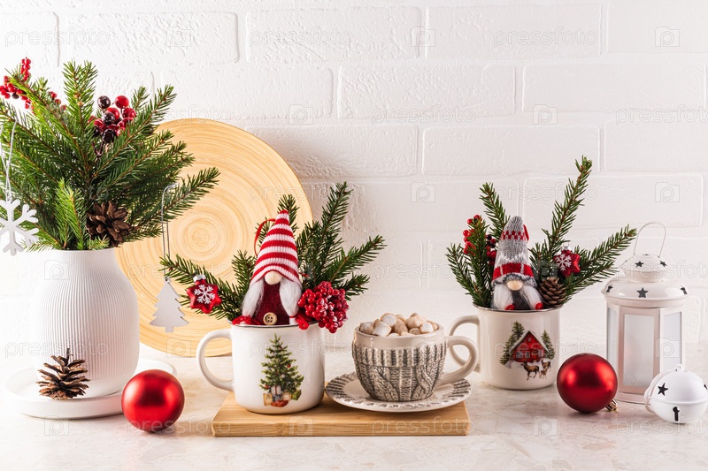 Кухонная столешница в интерьере Рождественское утро. Чашка какао с зефиром, веселые новогодние гномы, красные шарики, букет еловых веток