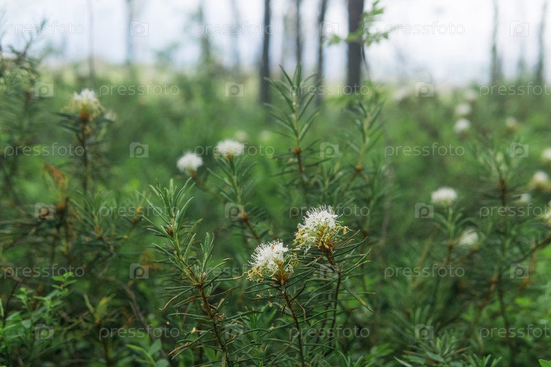 Размытый естественный фон с белыми цветами багульника на краю болота