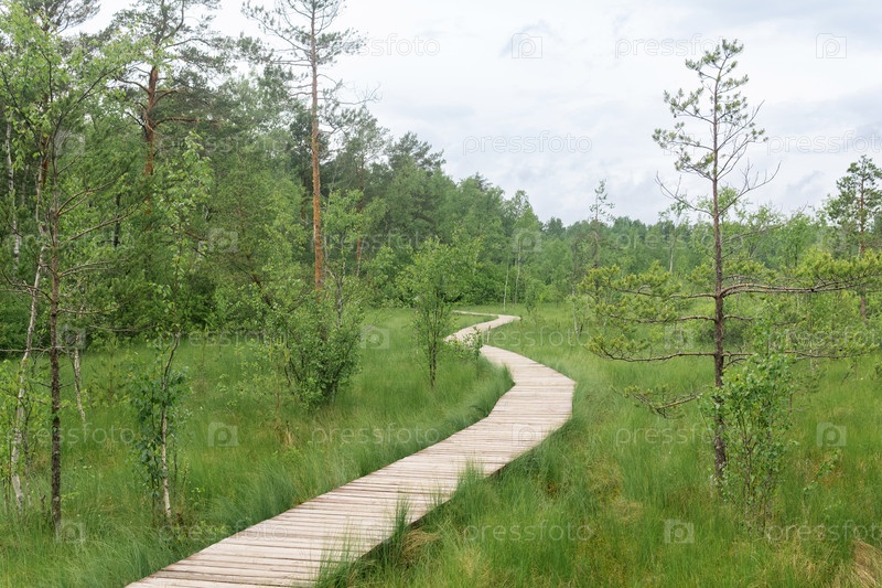 Деревянная дорожка на образовательной природной тропе среди охраняемого болотистого ландшафта