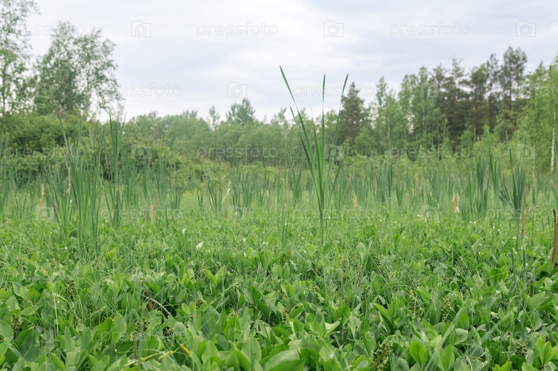 Зеленая растительность болота с осокой и болотными бобами на размытом фоне