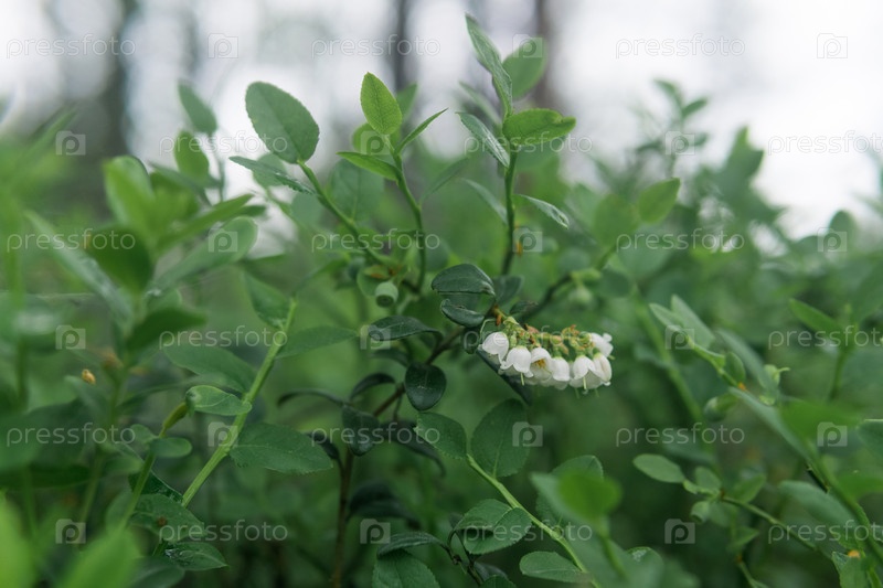 Размытый естественный фон с маленькими белыми цветками болотной брусники