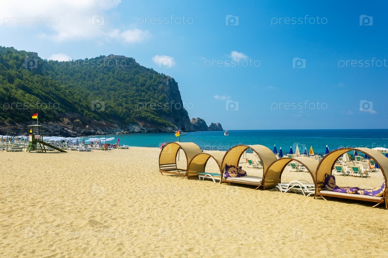 Красивый вид на пляж Клеопатры, Алания, Турция. Летний отпуск, пляжный отдых в Турции
