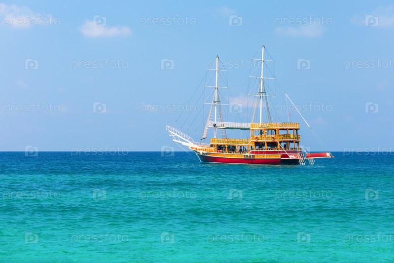 Прекрасный вид на деревянный путешествующий корабль в море в летний день. Концепция морского путешествия, летних каникул и тропического рая